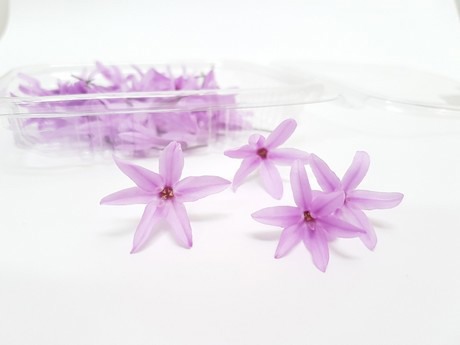 - La flor comestible liofilizada. Es un proceso altamente tecnológico, donde la flor mantiene todas sus propiedades y vistosidad. Tras un proceso de congelación o ultracongelación se elimina la humedad por altas presiones (sublimación), obteniendo un producto con una vida útil superior a los 2 años. El principal uso es en alta repostería.