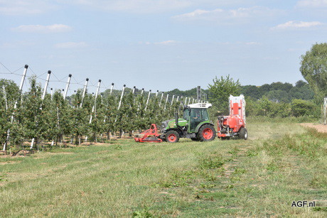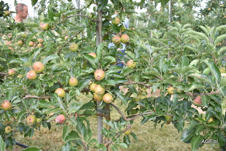 La plantación de manzanas, que Johannes muestra a los miembros visitantes de NFO, la organización de productores de fruta de los Países Bajos, consta de 16 hectáreas de Gala Schnico, 14 hectáreas de Elstar Red Flame y 3 hectáreas de árboles jóvenes de la variedad Magic Star. “El huerto está situado en una meseta que es más alta que el área circundante. Debido a la altura, tenemos pocos problemas con las heladas, pero en los últimos tres años hemos tenido muchos problemas con el granizo. Este año también lo hemos sufrido. Como resultado, el 80% de las manzanas Gala y el 60% de las Elstar resultaron dañadas. Afortunadamente, estamos bien asegurados, pero después de tres años, la compañía de seguros ya no está tan contenta con nosotros", continúa Johannes. “En los próximos años planeamos plantar alrededor de 60 hectáreas de manzanos más. Aunque se habla mucho de que hay demasiadas manzanas en el mercado, notamos que todavía hay demanda de manzanas y que aún hay espacio para expandirse".