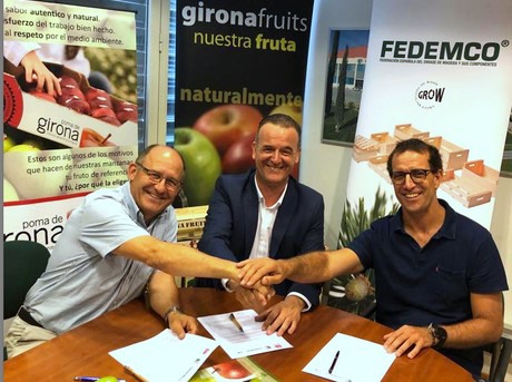 Los presidentes de Girona Fruits, D. Martí Ferre Pons y de IGP Poma de Girona, D. Llorenç Frigola Vidal, han firmado este miércoles en la sede de Girona Fruits un acuerdo de colaboración y promoción con el director de FEDEMCO (Federación Española de Envases de madera y sus componentes) D. Alberto Palmí.