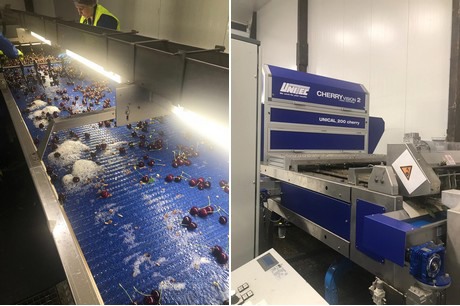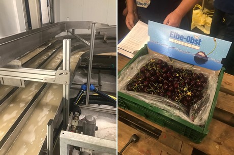 Izquierda: Elbe-Obst cuenta con tecnología de transportadores de vanguardia en la sala de producción. Derecha: cerezas frescas de Altes Land.