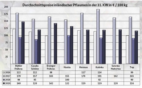 En el caso de las ciruelas, prevaleció la oferta alemana: principalmente, se pudo acceder a Katinka, Herman y Cacak. Las Cacak serbias jugaron un papel importante, pero faltaban en Fráncfort y Colonia. Las extranjeras de España e Italia complementaron los hechos junto a las de varios países de Europa del Este. La disponibilidad obviamente se amplió.
