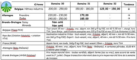 La tendencia es completamente inversa a la de la semana pasada, tras la vuelta de un tiempo más favorable para los cultivos. Las fábricas están actualmente cubiertas por los contratos y los precios en el mercado libre descendieron hasta los 20 €/q la semana pasada. Los mercados de productos frescos también están bajo presión, pero con menores descensos en los precios. Los lotes compactos se negocian entre 30 y 35 €/q al productor. Frieslander se sitúa entre 25 y 30 €/q. Se ha observado poca actividad en las exportaciones, con algunas transacciones hacia África, bajo la base de 30 a 35 €/q (calibrado en sacos para exportar).