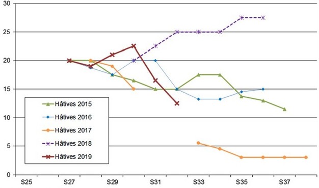 Las recogidas continúan fácilmente, la lluvia solo ha frenado localmente las actividades de la semana pasada. La demanda interior en las nuevas cosechas sigue siendo estable. Las exportaciones hacia el continente se han ralentizado, pero el interés de los diversos compradores sigue existiendo.
