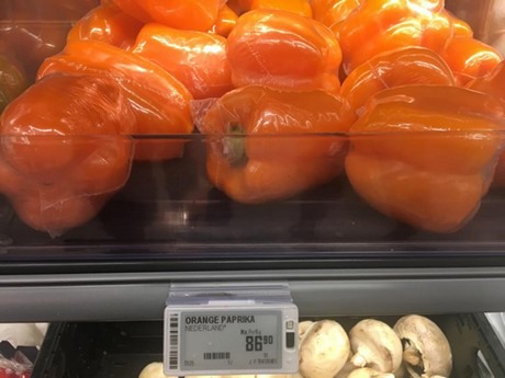 Además de encontrar pimientos holandeses en los grandes mercados como Alemania e Inglaterra, también se pueden encontrar en Noruega, como se puede ver en esta foto. Un precio de 86 coronas noruegas, o 8,60 euros por kilo, no suena mal.