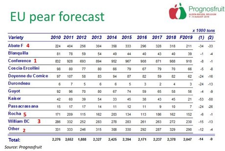 "Actualmente nos quedan pocas existencias en Europa y la temporada de ultramar casi ha terminado. Los precios actuales de las peras de verano son más altos de lo normal", comenta Helwig Schwartau, de la consultora alemana de productos agrícolas Agrarmarkt Informations-Gesellschaft (AMI). "Los productores y comerciantes de peras Conferencia en el Benelux están bastante relajados e incluso se están preguntando si todavía necesitan el mercado ruso. La menor cosecha de Abate Fetel plantea la cuestión de en qué mercados la Conferencia se puede beneficiar de esta situación".