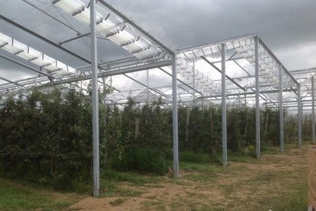 La mitad de la parcela de cultivo de manzanas (0,3 hectáreas) de este huerto experimental se ha equipado con la cubierta convertible. Cuando llueve, la cubierta se cierra, lo cual garantiza que los árboles se mantengan secos. La cubierta pasa de la posición abierta a la cerrada en dos minutos y medio. El investigador Rien van der Maas indica: "Durante el cultivo, las manzanas pueden estar expuestas a la Botrytis, a la sarna del manzano y a Neonectria ditissima, las cuales pueden causar daños considerables. Podría ser posible evitarlas manteniendo secos los árboles. La cubierta convertible también podría mantener una plaga alejada de los manzanos. Por ejemplo, podemos cerrar temporalmente los laterales de la parcela para evitar la entrada de cápsido verde común. Así, los productores no tendrán que usar fitosanitarios para asegurarse de que sus cultivos están libres de estas enfermedades fúngicas y plagas".