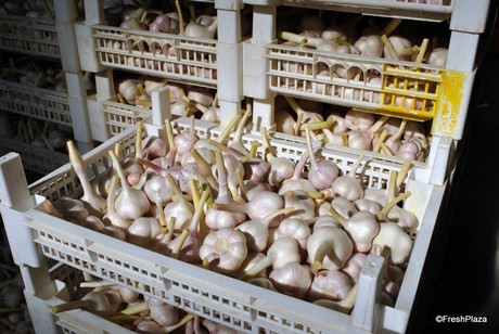 Trabajadores estacionales rumanos en el procesamiento manual de ajo fresco