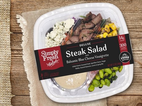 La nueva ensalada de su marca Simply Fresh incluye un filete con cilantro, queso azul, un popurrí de hortalizas, edamame asado y zanahorias sazonado con vinagre balsámico de queso azul.
