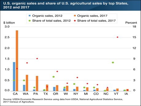 Las ventas agrícolas promediaron $ 400.603 en las operaciones ecológicas de 2017, más del doble del promedio de ventas agrícolas en todas las fincas ($ 190.245). La participación ecológica en las ventas agrícolas de EE. UU. se duplicó al 2 por ciento entre 2012 y 2017, y fue superior al 6 por ciento en algunos estados. En esa misma época, California fue el principal estado en cuanto a ventas agrícolas ecológicas y convencionales. La mayoría de los otros estados con producción ecológica se encontraban en el noroeste del Pacífico (un importante productor de productos ecológicos), el Medio Oeste (un importante productor de leche ecológica) y el noreste (con muchas fincas ecológicas a pequeña escala).