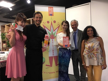 Desde la derecha: Sara Grasso y Salvo Laudani, de Oranfrizer, durante la reciente visita de la compañía a Japón
