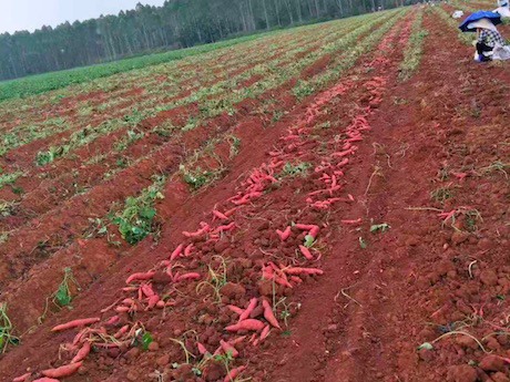 "Tenemos una plantación en Guangxi con una superficie de 100 hectáreas. Esta extensión produce batatas de la variedad Sandía Roja. También tenemos una plantación de 200 hectáreas donde cultivamos batatas fragantes. El período de suministro de batatas Sandía Roja comienza todos los años en julio y continúa hasta abril del año siguiente. Las batatas fragantes se pueden suministrar durante todo el año. Los comentarios del mercado muestran que los consumidores chinos prefieren la variedad de batata fragante frente a la Sandía Roja. Esto se debe principalmente a que el período de crecimiento de la batata fragante es más corto, alrededor de 100 días, lo que hace que esta variedad sea más suave y dulce".