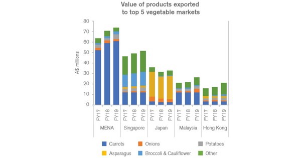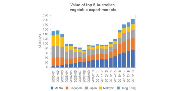 El valor de las exportaciones de hortalizas a la zona MENA aumentó por undécimo año consecutivo en 2018/19. Las zanahorias representaron el 82,4 por ciento del valor de las exportaciones de hortalizas a la zona y han sido responsables de la mayor parte del crecimiento del valor de las exportaciones de hortalizas a este mercado en los últimos 11 años. El valor de las exportaciones de zanahoria aumentó en $ 2 millones (+3,4 por ciento) en 2018/19 a medida que la demanda se suplió con una mayor producción en Australia. Las exportaciones de patata a MENA aumentaron en $ 1,7 millones (+69,5 por ciento) en 2018/19, ya que Australia pudo llenar parte de la brecha en la oferta de importación creada por la menor producción europea.