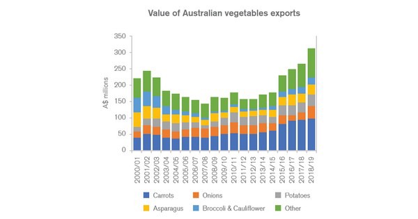 Las exportaciones de hortalizas australianas casi se han duplicado desde 2011/12, después de un séptimo año consecutivo de crecimiento en 2018/19. El crecimiento en el valor de las exportaciones se benefició del efecto de la recuperación en el precio promedio de exportación de las hortalizas después de una disminución en 2017/18; sin embargo, fue un aumento en el volumen de exportación, resultante del aumento de la producción, el que tuvo el mayor impacto en el crecimiento del valor.