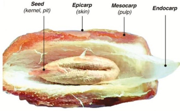 La anatomía del dátil en la fase Tamr, puede verse el epicarpio, mesocarpio, endocarpio y la semilla.