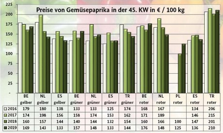 Precios de pimientos por país en la semana 45 (en euros/100 kg); pimientos amarillos: primeras tres columnas; pimientos verdes: las cuatro columnas siguientes; pimientos rojos: últimas cinco columnas)