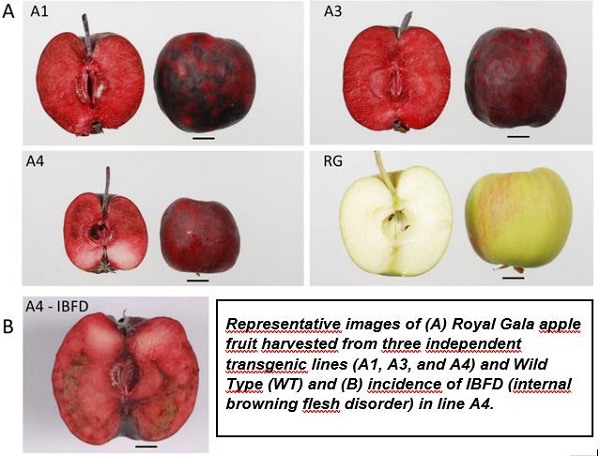 Los científicos del Instituto de Nueva Zelanda para la Investigación de Plantas y Alimentos han investigado el IBFD comparando manzanas Royal Gala que sobreexpresan el factor de transcripción relacionado con la antocianina (TF) MYB10 (35S: MYB10), que produce fruta con pulpa altamente pigmentada, con la Royal Gala Wild Type (WT) producida en las mismas condiciones.