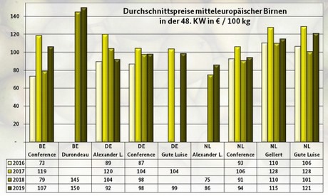 El suministro de peras se basó en ofertas italianas, principalmente de Abate Fetel, Santa Maria y Williams Christ. Las peras Red Williams Christ y las Bosc complementaron la oferta. Los Países Bajos mandaron peras Gute Luise y también Conferencia y Gellert. Las peras alemanas de las variedades Alexander Lucas, Conferencia y Gute Luise completaron el suministro. Las deliciosas peras nacionales Köstliche aus Charneux se despacharon rápidamente en Berlín a un precio de 1,00 a 1,20 € por kg.