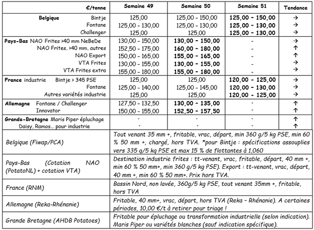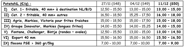 Numerosos agentes industriales han comprado la semana pasada para entrega tardía, sobre todo de Fontane, Innovator y Markies, bajo una base de 18,00 €/q con entrega en abril/mayo. Para entrega inmediata, hay oferta puntual de lotes de menos buena conservación, que determina el precio de base (Cat. 1), mientras que las patatas con capacidad para freír superior ganan más de 0,50 €/q, a 17,00 €/q de media. Las exportaciones a Inglaterra sostienen claramente el valor de los lotes con capacidad para freír. Los exportadores de patata fresca han tenido hasta ahora una buena temporada, principalmente hacia destinos lejanos estas últimas semanas. Pero el comercio hacia el este de Europa también sigue estando presente. Los precios para el productor han progresado hacia los 15,00-17,00 €/q.