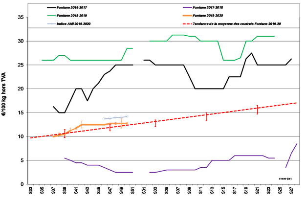 Fontane: de 12,50 a 13,00 €/q; los exportadores compran lotes de gran calibre y de buena cocción hasta a 15,00 €/q para Inglaterra (industria y pelado).