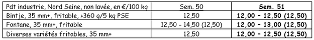Bintje: de 12,50 a 15,00 €/q; los principales agentes industriales continúan pagando el precio de base, pero algunos peladores tienen dificultades para encontrar los lotes adecuados y pagan hasta 15,00 €/q para las de calidad superior (gran calibre, buena cocción).