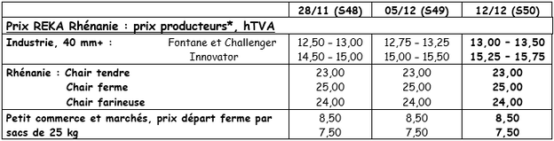 Fontane: de 12,50 a 13,00 €/q; los exportadores compran lotes de gran calibre y de buena cocción hasta a 15,00 €/q para Inglaterra (industria y pelado).