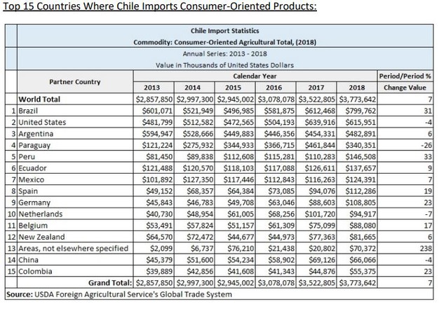 Chile, con 18,8 millones de habitantes, importó en 2018 hortalizas por 9.880.000 euros, frutas por 159.568.000 euros y frutos secos por 31.989.000 euros. Brasil, Estados Unidos y Argentina son los países que más exportan a Chile.
