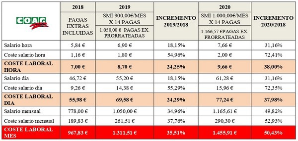 La Coordinadora de Organizaciones de Agricultores y Ganaderos (COAG) alerta de que la subida del salario mínimo interprofesional (SMI) a los 1.000 euros podría suponer un aumento del 50,4% de los costes laborales para los agricultores, al pasar de 967 € por trabajador/mes en 2018 a 1.455 € en 2020. Así lo recoge la simulación realizada por los Servicios Técnicos de la coordinadora en base los datos reales de una explotación media, con 2-3 trabajadores fijos.