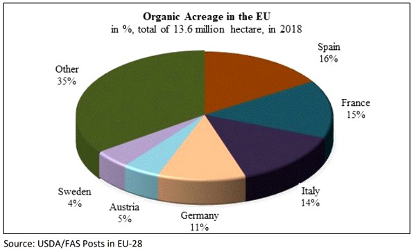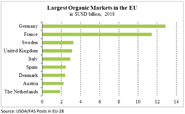 En 2018, el mercado europeo de productos ecológicos aumentó un 18% hasta alcanzar casi 41.000 millones de euros. Alemania y Francia son los principales actores del mercado ecológico en la UE, representando juntos más de la mitad de las compras. El mercado ecológico de todos los países de la UE creció en 2018, con la excepción de Italia. En 2018, casi 14 millones de hectáreas en Europa se destinaron al cultivo ecológico. Los mayores productores se encuentran en España, Italia, Francia y Alemania.