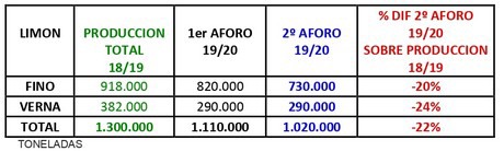La tercera estimación de cosecha (aforo) de limón de la Asociación Interprofesional de Limón y Pomelo, AILIMPO, para la campaña 2019/2020, actualiza las cifras publicadas en septiembre, y prevé una estimación de producción total de 1.020.000 toneladas, lo que supone una reducción del 22% sobre la cosecha de la campaña anterior 2018/2019, que alcanzó la cifra récord de 1.300.000 toneladas.
