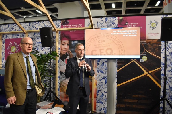 Peter van Ostaijen (CBA) y Wim Rodenburg (GroentenFruit Huis) presentan el nuevo estándar CFQ para cajas de cartón.