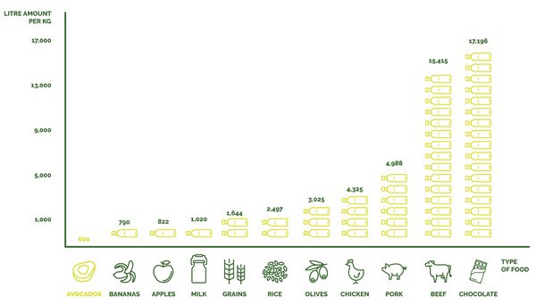 La cantidad actual de agua puede parecer alta, pero en comparación con frutas como las bananas (790 litros) o las manzanas (822 litros), la cantidad de agua que necesitan los aguacates está por debajo de la cifra promedio en el mercado de frutas y hortalizas. En cuanto a los cereales, el arroz requiere 2.500 litros por cada kilo producido. Por otro lado, en los alimentos de origen animal, como el pollo y ternera, la cantidad respectiva de agua utilizada alcanza los 4.325-15.415 litros, según estudios de la Institución de Ingenieros Mecánicos (IME).