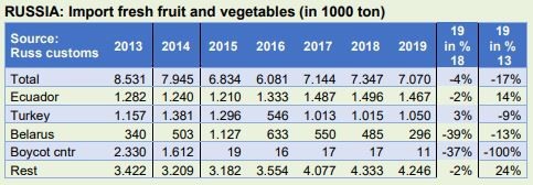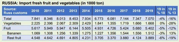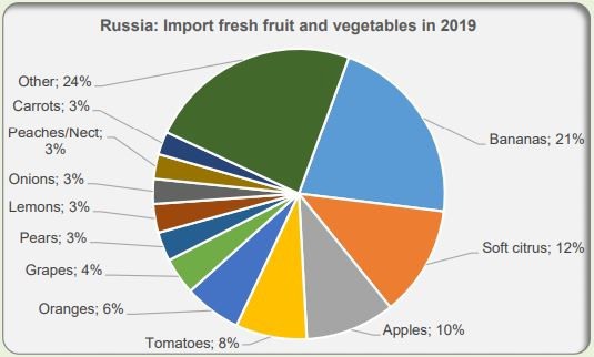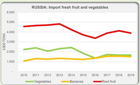 A pesar del veto de 2014, la importación rusa de frutas y hortalizas frescas mostró una recuperación en los últimos años. Sin embargo, en 2019 ha vuelto a caer. En comparación con 2018, las importaciones de productos hortofrutícolas se han reducido un 4%. Las hortalizas frescas se mantuvieron en el mismo nivel que en 2018, pero la importación de fruta fresca se redujo un 5%. Fue sorprendente el fin del crecimiento de las importaciones de bananas, mientras que fue notable la reducción de los volúmenes de manzanas (-17%), peras (-16%) y melocotones/nectarinas (-15%). Después de las bananas, las mandarinas son el segundo producto más importado. Los volúmenes de mandarinas ingresados al mercado ruso nunca han sido tan grandes como lo fueron el año pasado. La importación de tomates, naranjas y uvas fue menor que en 2018, mientras que se trajeron a Rusia más cebollas y coles que en otros años. Los aguacates y los mangos, aunque representan cantidades menores, crecieron.