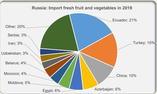 De los países proveedores, Ecuador es el más grande (bananas), seguido de Turquía y China. Sin embargo, las importaciones procedentes de China se redujeron en más del 10%, provocando una caída brusca del crecimiento constante. Los envíos a Rusia de manzanas chinas en particular cayeron en el último año, pero también hubo menos presencia de mandarinas y tomates chinos en los mercados rusos en 2019. Sin embargo, hubo más pomelos, coles y pimientos chinos.