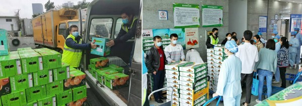 "Esa mañana, cuatro vehículos de Joy Wing Mau, cargados con 2.900 cajas de fruta fresca y alta calidad, llegaron al hospital. La persona al cargo expresó su sincero agradecimiento por apoyar la primera línea de acción contra la epidemia. "Les daremos estas frutas a los pacientes y al personal médico de manera ordenada, muchas gracias". Después, preguntó sobre el origen y la variedad de la fruta.