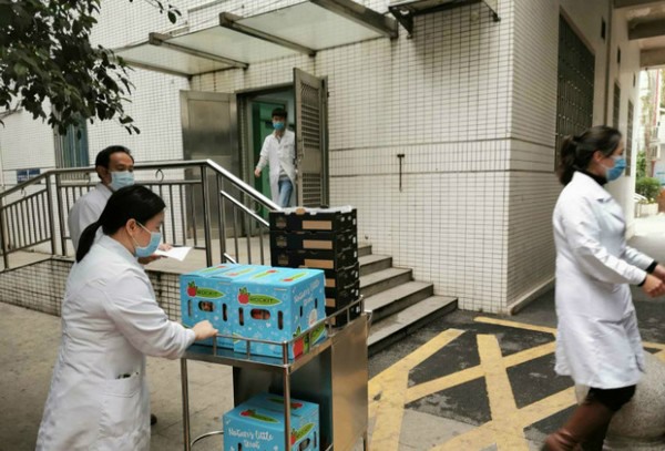 Los empleados de Joy Wing Mau en el hospital entregando la fruta donada al personal médico: Foto: Joy Wing Mau.