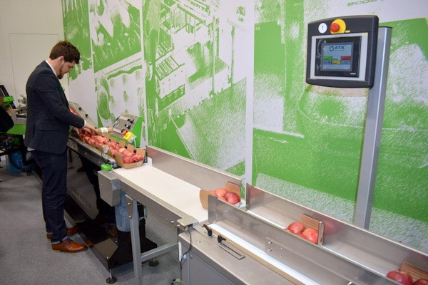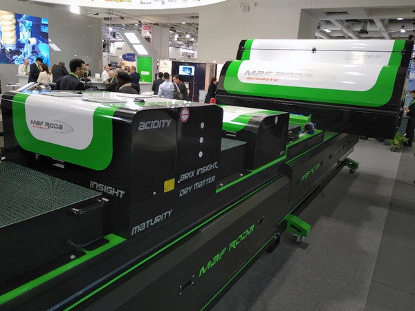 La quinta máquina presentada por MAF RODA Agrobotic es la calibradora Pomone 125: una calibradora para varias frutas que las clasifica en función del calibre y de la calidad externa analizada por Globalscan 7, y de la calidad interna, medida con Insight, para la maduración, la materia seca y la tasa de azúcar (grado Brix). La máquina puede trabajar con pimientos, peras largas, mangos, cebollas y aguacates grandes y otros productos de gran dimensión. Además, se acaba de instalar un robot para el calibrado de kiwis en Nueva Zelanda. Uno de los objetivos de este robot es reducir la manipulación de las frutas con las manos, asegurando así la integridad del producto al máximo.