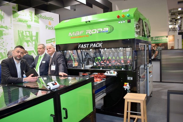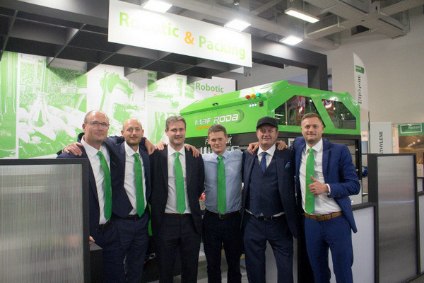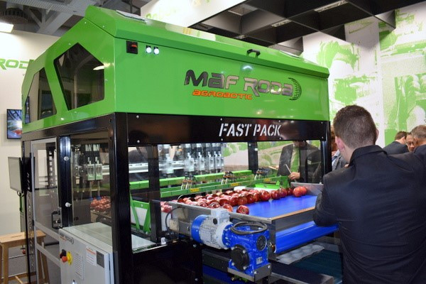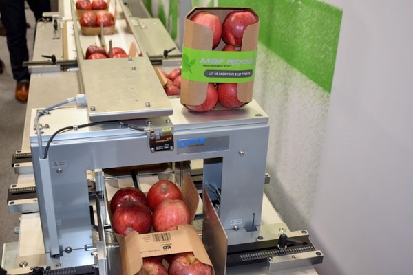 MAF RODA Agrobotic también presentó varios robots de envasado, como la embaladora para el envase de manzanas en bandejas reciclables. Este equipo de envasado automático responde a la demanda creciente de envases responsables con el medio ambiente. El sistema permite envasar las frutas en barquetas de cartón colocando una banda de papel sellada en frío. La tensión de la banda se puede regular en función del número de frutas envasadas y de la barqueta, adaptada para 4, 6 u 8 frutas.