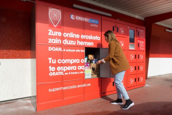 Eroski dispone de cuatro modalidades de entrega de pedidos online. La tradicional entrega a domicilio, siendo el único operador que ofrece este servicio en el 100% del País Vasco, Navarra y Baleares, y que además cuenta con entrega exprés en el día en las capitales. Asimismo, para los clientes que no pueden esperar en casa, cuenta con una red de puntos de recogida con diferentes modalidades: en tienda, con recogida en coche o a pie y ahora en taquillas inteligentes; todos ellos gratuitos y con un servicio de entrega en menos de 4 horas.
