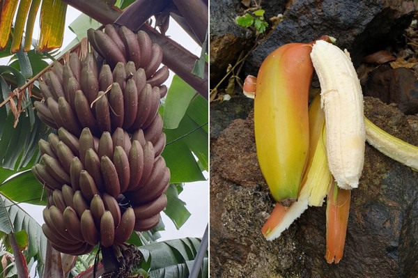 El plátano rojo presenta un color entre púrpura y marrón. Su cáscara es más gruesa que la de los plátanos amarillos. Sin embargo, el fruto es más pequeño y se caracteriza por un color entre amarillo y rosa pálido. Lo que más sorprende es su sabor dulce y ligero que recuerda mucho a las frambuesas.