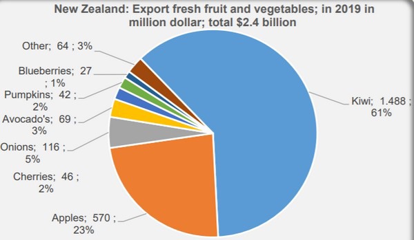 Nueva Zelanda exportó una cantidad récord de frutas y hortalizas frescas en 2019, totalizando 1,38 millones de toneladas. Esa cantidad fue un 5% más que en 2018 y también un poco más que en el año récord 2016. El valor total era de 2.400 millones de dólares y los kiwis fueron, con mucho, el producto más exportado. En volumen, el kiwi representa una cuota del 44% de los envíos y en valor incluso el 60%. Sin embargo, en el último año, la exportación de 610.000 toneladas de kiwis ha sido un poco inferior a la de 2018, cuando se exportaron 620.000 toneladas.