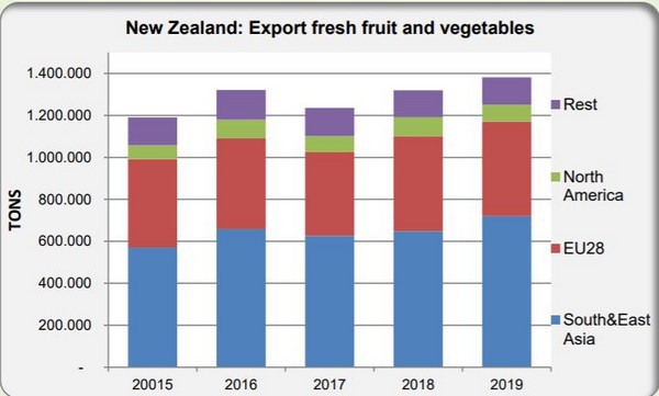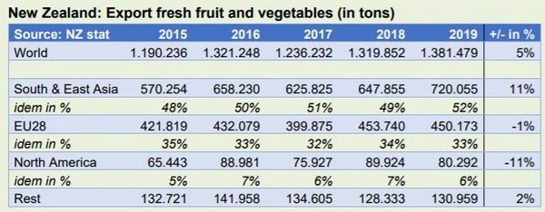 Más de la mitad de las exportaciones de frutas y hortalizas frescas de Nueva Zelanda se destina a países del sur y este de Asia. La participación de esa región ha aumentado ligeramente en los últimos años. En total el año pasado se enviaron 720.000 toneladas al sur y al este de Asia, un 11% más que en 2018. Las exportaciones a la UE, la segunda mayor región de ventas, cayeron ligeramente. Ambas regiones juntas representan el 85% del total. En lo que respecta a los países individuales, no está tan claro, ya que la oficina de estadísticas de Nueva Zelanda no especifica los envíos a la UE por país, aunque esta cifra se refiere principalmente a las exportaciones a Bélgica. Al igual que en 2018, aproximadamente 200.000 toneladas de frutas y hortalizas frescas se exportaron a Japón.