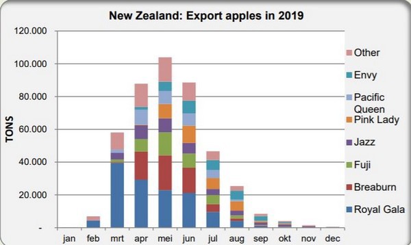 Las exportaciones de Braeburn cayeron después de que se hubieran incrementado en 2018. La Braeburn se destina principalmente a países de la UE. Fuji, la tercera variedad en importancia, se dirige principalmente a países asiáticos y especialmente a Taiwán. El Reino Unido es el principal mercado para las variedades Jazz y Pink Lady. Las exportaciones de manzanas Jazz disminuyeron un 10%, mientras que las exportaciones de Pink Lady crecieron un 10%.