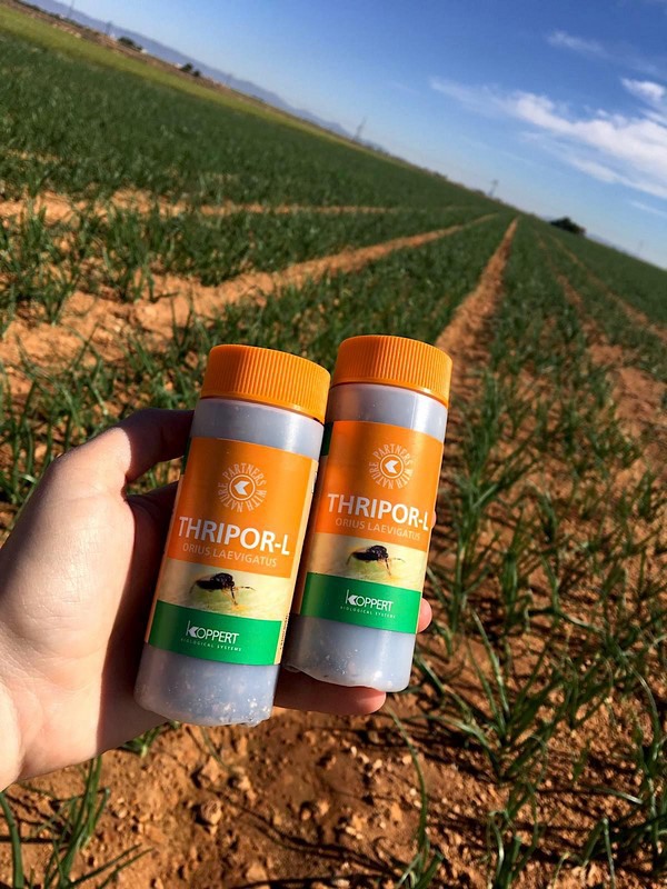 Para el control biológico de trips en cebolla ecológica, Koppert ofrece una estrategia basada en sueltas del chinche depredador Orius laevigatus, que recibe el nombre comercial de Thripor. Se recomienda que las primeras sueltas de Orius se realicen cuatro semanas después de la siembra, aunque lo mejor es contar con el asesoramiento especializado de los técnicos de Koppert, quienes decidirán la dosis adecuada en cada caso.