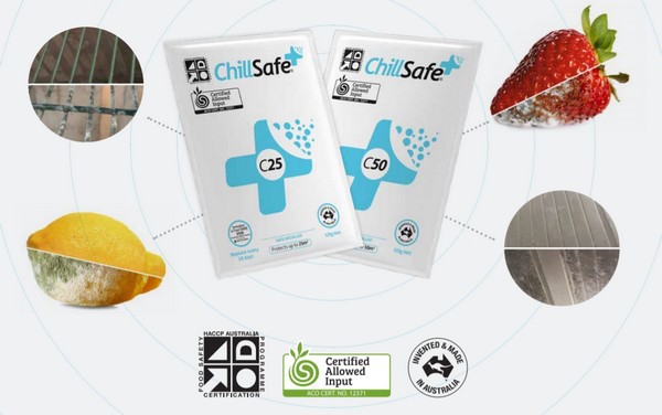 ChillSafe® es un sobre fácil de usar que produce una baja dosis de peróxido de hidrógeno vaporizado para tratar espacios en los que se envasan, conservan o transportan los alimentos para que los productos sean más seguros y aguanten más tiempo. Quince años de desarrollo, investigación universitaria y gubernamental combinados con las certificaciones HACCP y Organic han demostrado que la tecnología es efectiva en la protección contra contaminación microbiana, etileno y olores.