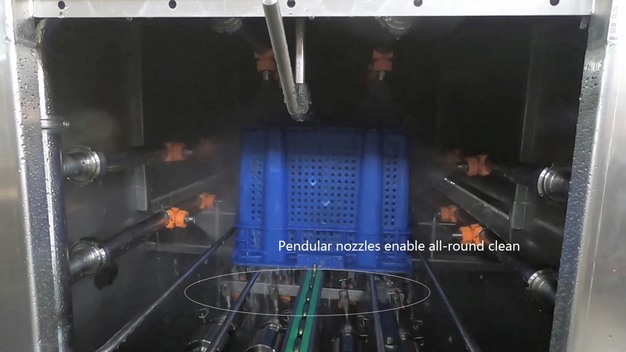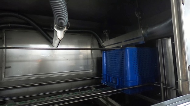 Después del lavado, la cinta transportadora lleva las cajas hasta el proceso de secado. Esta lavadora de cajas se puede conectar con la apiladora para conseguir una automatización completa. "Esta máquina es una elección económica. Ayuda a las fábricas a lograr grandes ahorros en agua y mano de obra".
