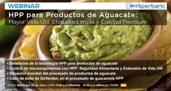 Hiperbaric, el fabricante líder mundial en equipos de procesado por altas presiones (HPP) para la industria alimentaria, consciente desde siempre de la relevancia que su tecnología tiene en la industria aguacatera, organiza un webinar gratuito donde se hablará acerca de las características, el impacto y los beneficios del procesado por altas presiones en productos de aguacate, así como de las opciones de envasado y la gama de equipos industriales HPP diseñados por Hiperbaric.