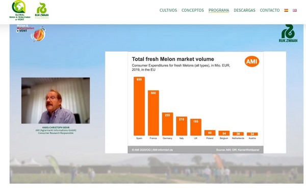 Los expertos invitados fueron, Hans-Christoph Behr AMI (Agrarmarkt Informations-GmbH), que analizó el mercado europeo de melón y sandía y destacó el aumento de consumo de la categoría “Las innovaciones en formatos más pequeños y sin semillas incrementan la demanda” ; Cindy Van Rijswick, Rabobank Research Food & Agribusiness, mostró una visión del impacto del Covid-19 en el sector de la fruta fresca internacional y comentó “Existen nuevas prioridades saludables para los consumidores y nuevas oportunidades para productores”; Marian García, más conocida como Boticaria García, Doctora en Farmacia, Nutricionista y Divulgadora de amplio espectro en RNE, Zapeando y El Mundo, ofreció una charla disruptiva para conectar con el consumidor, dónde los productores “somos los buenos de la película”.