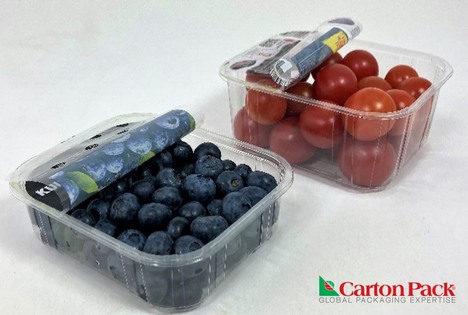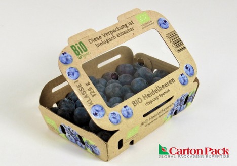Se trata de la alternativa en cartón ondulado al conocido clamshell de rPet de Carton Pack. "Este modelo patentado, además de tener una fuerte resistencia a la humedad y características particulares de robustez estructural, se presta perfectamente a los procesos de confección automatizado en la línea de llenado y cerrado".