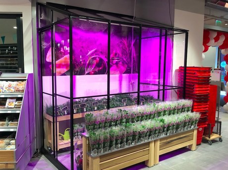 La sala está iluminada con lámparas led de color violeta, y los contenedores de las hierbas están apilados, los unos sobre los otros. Claramente, puede considerarse agricultura vertical. Este concepto está ganando aceptación entre los agricultores, en especial entre los que cultivan hierbas aromáticas, hortalizas de hoja y microvegetales, y flores comestibles.
