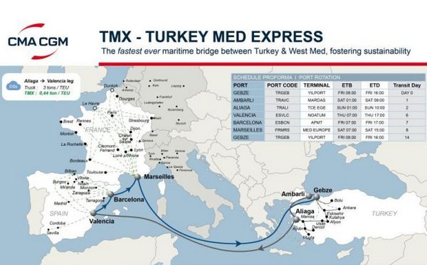 CMA CGM se complace en anunciar la puesta en marcha de un nuevo servicio de transporte marítimo de corta distancia en el Mediterráneo, el puente marítimo más rápido que existe entre Turquía occidental y el Mediterráneo occidental: TMX – TURKEY MED EXPRESS, a partir del viernes 18 de septiembre desde el puerto de Gebze.